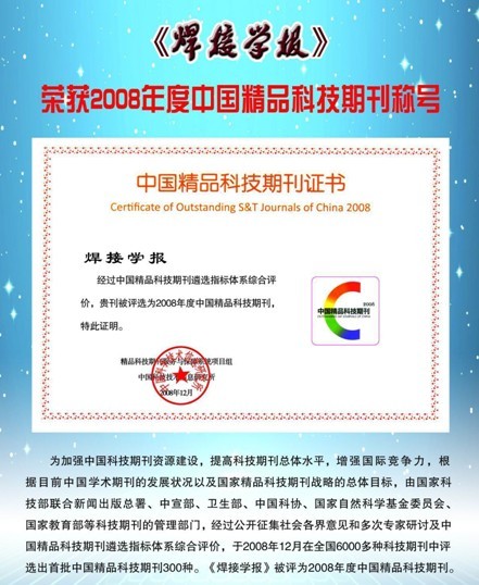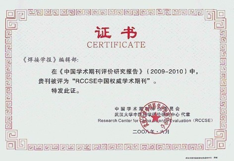 在《中國學(xué)術(shù)期刊評(píng)價(jià)研究報(bào)告(2009-2010)》中,《焊接學(xué)報(bào)》被中國學(xué)術(shù)期刊評(píng)價(jià)委員會(huì)評(píng)為RCCSE中國權(quán)威學(xué)術(shù)期刊。